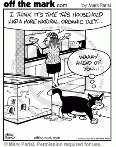 Organic Cat Diet A woman thinks her household needs a more natural, organic diet, but her cat has already eaten her fish.