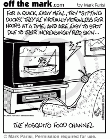 Mosquito Food Channel Sitting Duck A mosquito watches a 'sitting duck', a fisherman, on the food channel.