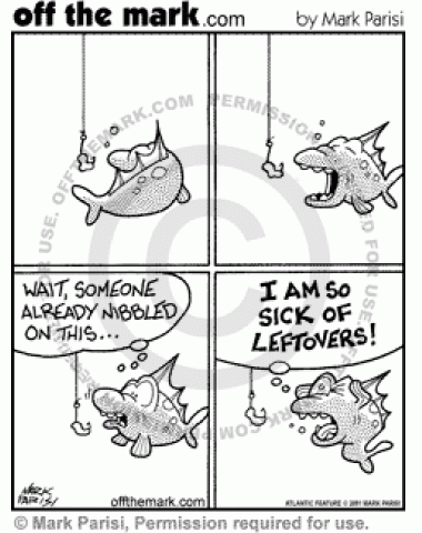 Fish Sick Leftovers A fish is sick of having leftovers.