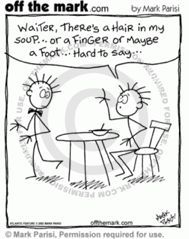 A stick figure has an undeterminable body part in his soup.