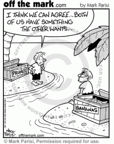 Desert Island Barter Two men on separate desert islands barter what goods they have.