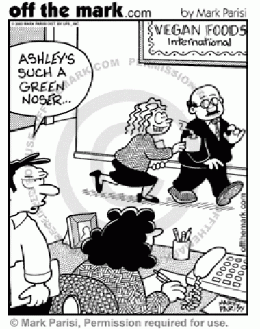 An employee of a Vegan Foods company is a green noser with the boss.