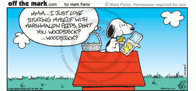 Snoopy eats Woodstock by accident while eating marshmallow peeps.