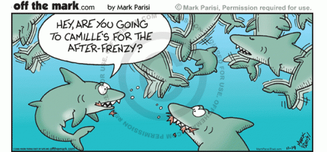 Shark After-Frenzy A shark asks his friend if he's going to the after-frenzy.