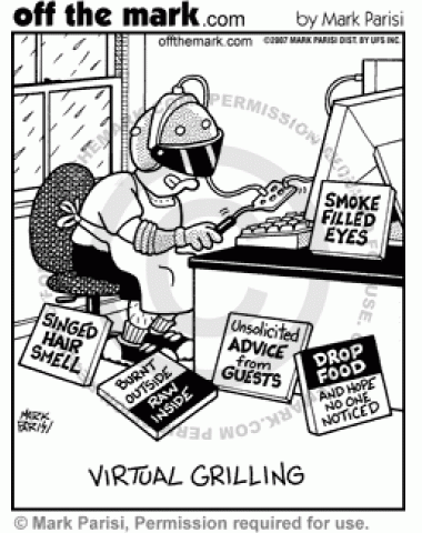 Virtual Grilling A man runs a complicated grilling simulation on his computer.
