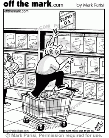 Stupid Cereal Shopping A man stands dangerously on shopping cart to reach a box of stupid o's cereal on top shelf.