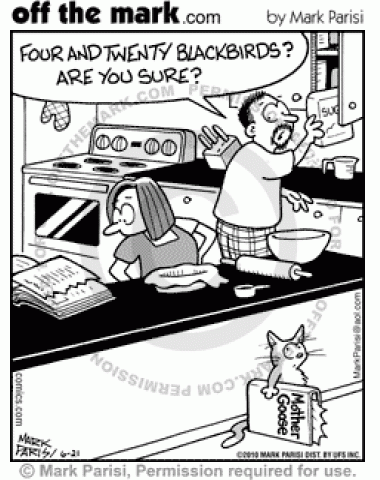 Cat Blackbird Recipe Cat replaces pie recipe with nursery rhyme about blackbirds baked in a pie.