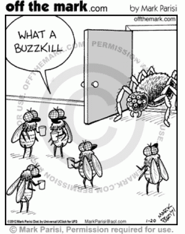 Spider Buzzkill Spider's entrance into party is literally a buzzkill for the flies.