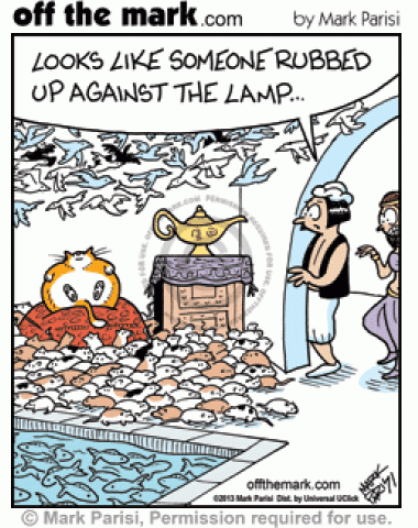 Cat's Genie Wishes A woman's cat rubs up against a magic lamp and wishes for fish, mice, and birds.