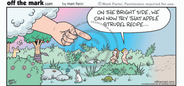 Adam and Eve get kicked out of the Garden of Eden, but now they have apples and can try Adam's apple strudel recipe.