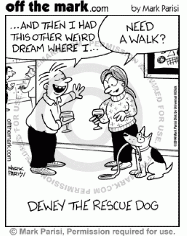 Dewey The Rescue Dog A dog rescues a woman from boring conversations by pretending to need a walk.