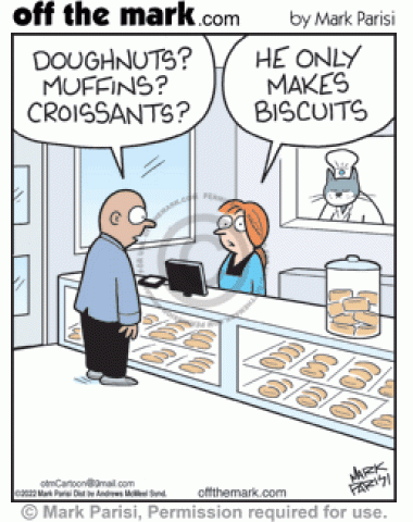 Bakery customer asks server for other baked goods but cat baker only kneads biscuit dough with paws.