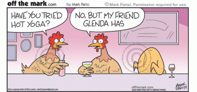 Chickens friends drink at bar, asks if tried hot yoga workout & hen answers plucked & roasted chicken Glenda has.