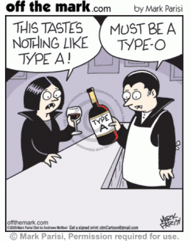 Vampires’ Type-O Blood Wine Label Typo Mistake Vampire drinking blood at bar says it doesn’t taste like Type A & bartender says bottle is a type o.