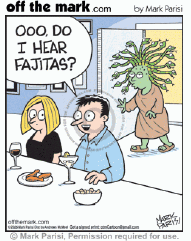 Medusa’s Snakes’ Hiss Mistook For Fajita Sizzle Guy at restaurant mishears Medusa’s hissing snake hair as sizzling fajitas behind him.