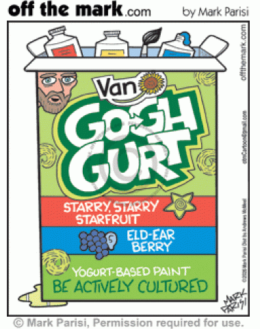 Van Gogh-Gurt Artistic Cultured Yogurt Vincent Van Gogh painter spoof Go-Gurt Starry Night Starfruit & Elderberry Ear yogurts.