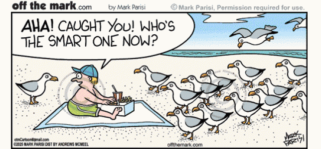 Clever seagull distracts foolish guy at beach as gulls sneak behind to steal french fries.