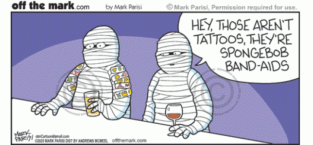 Tough Guy Mummy’s Tattoos SpongeBob Band-Aids Mummy lady at bar on date with fake tattooed arms mummy man sees they’re cartoon Sponge Bob BandAid bandages.