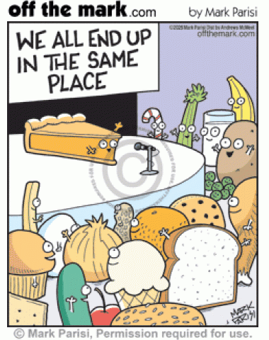 Pie’s Unifying Digestion Message Brings Foods Together Motivational speaker dessert onstage teaches different food followers they all end up in the same place.