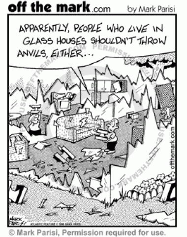 Glass Houses Anvils A man who lives in a glass house throws an anvil.