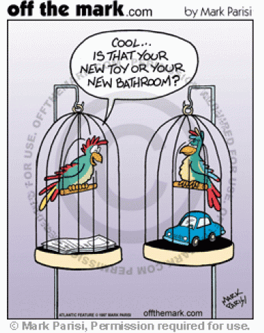 Parrot Bathroom A parrot has a tiny car to poop on.