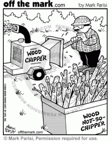 Not Chipper Wood Chipper Wood that isn't chipper is sent through a wood chipper.