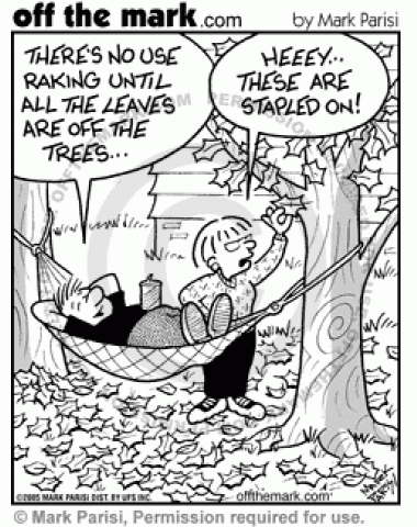 Autumn Leaves Raking Chore Trick Husband tells wife he will rake leave when they all fall but he's stapled the leaves to the tree.
