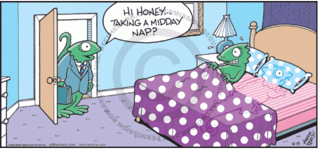 Cheating Chameleon Husband finds his wife in bed but doesn't see the other man.