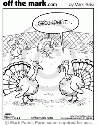 Turkey sneezes snood off across to another turkey.