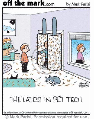 Sticky rollers invention cleans dog & cat hair covered owners’ clothes exiting home.