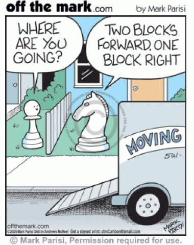 Chess Knight Moves New Home 2 Blocks Away & 1 Over Game piece asks horse neighbor moving house where going & says it two blocks forward, one block right.