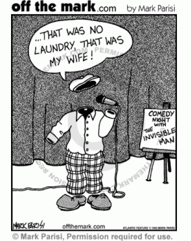 The Invisible Man at Comedy Night makes a joke, saying "That was no laundry, that was my wife," implying invisible wife got washed.