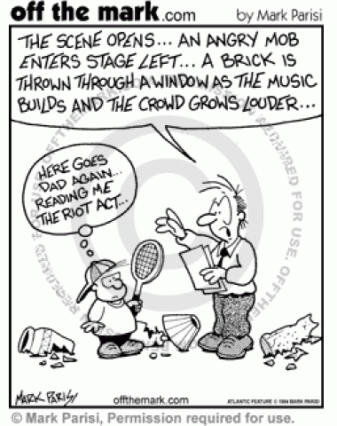 Riot Act A kid breaks things with his tennis racket, so his dad reads him the riot act of a play.