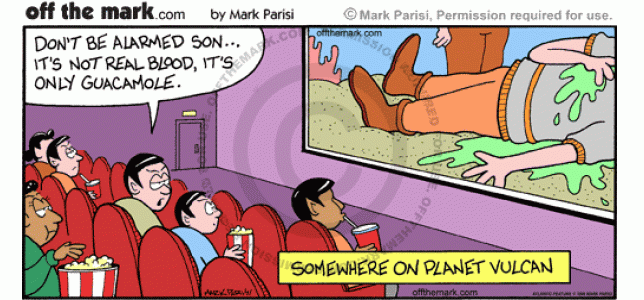 Vulcan Horror Movie A vulcan dad tells his kid not to be scared because the green blood in the movie is guacamole instead of real blood.