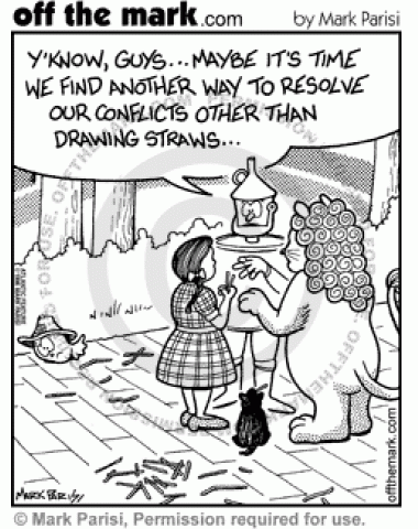 Wizard of Oz Conflict Resolution The characters from the Wizard of Oz drawing straws from the Scarecrow's body to resolve an argument.