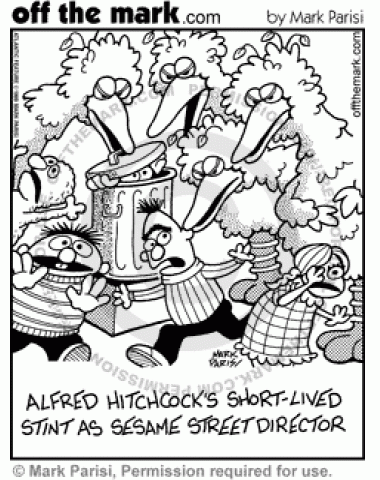 Alfred Hitchcock works on Sesame Street and remakes The Birds with Big Bird.