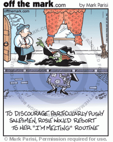 Melting Witch Salesmen A witch uses her 'I'm melting' routine on salesmen.