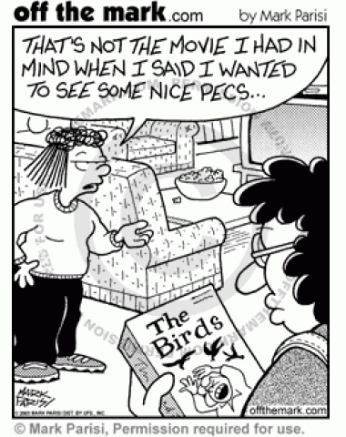 The Birds Pecs A woman wants to see some nice pecs, but gets The Birds instead.