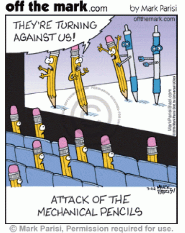 Pencil horror film involves mechanical pencils attacking traditional pencils.