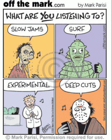 Scary movie monsters listen to zombie slow jams, swamp creature, surf, mad scientist experimental and Friday the 13th Jason deep cuts musical styles.
