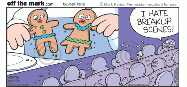 Sad Xmas Cookies Hate Romance Movie Breakup Scenes Gingerbread man romantic film audience cries as baker breaks up cookie couple.