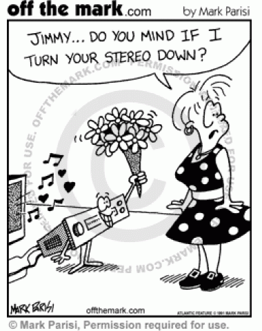 Stereo Gets Romantic Woman asks Jimmy if she can turn his stereo down because stereo is turned on, playing romantic music, and trying to give her flowers.