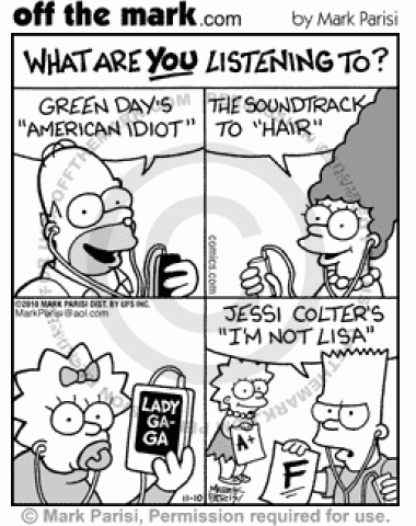 Simpsons Listen To Songs Homer, Marge, Maggie, Lisa, and Bart Simpson are listening to.