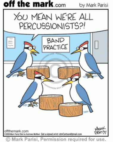 Woodpecker Drum Band All Percussion Musician woodpeckers in band practice with wood drums are all percussionists.