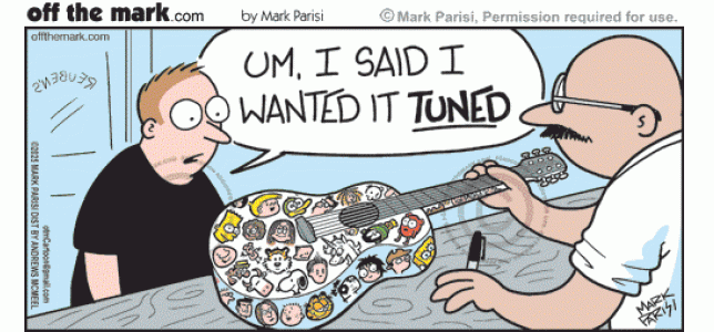 Music Shop Guitar Toon Tuning Mix Up Customer says he wanted guitar covered in cartoon character pictures to be tuned.