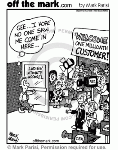 Lingerie Store Embarrassment Man walking into ladies' intimate apparel store hopes no one saw him, not realizing there's a big celebration waiting because he's the one millionth customer.
