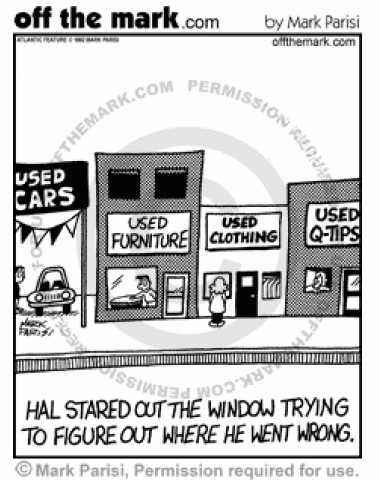 Retail Store Fail Hal stares out window of a Used Q-Tip store, wondering where he went wrong because other stores offer used cars, used furniture, and used clothes.