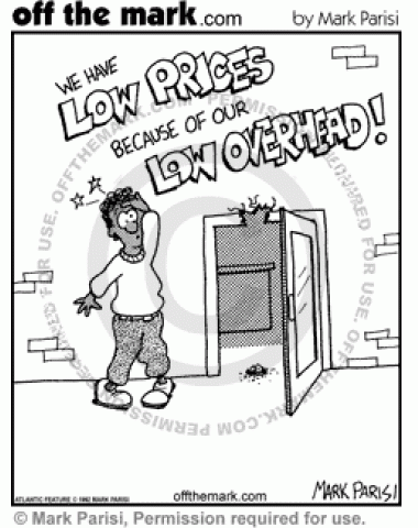 Low Overhead Truth Store displays sign about having low prices due to low overhead, while a customer nurses an injury from bumping his head on the low doorframe.