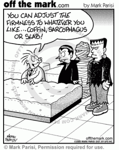 Adjustable Bed for Monsters A group of monsters look at a bed that can be adjusted to whatever firmness they like.