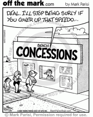 Beach Concession Speedos A beach concession clerk is offended by the overweight customer in a Speedo bathing suit.